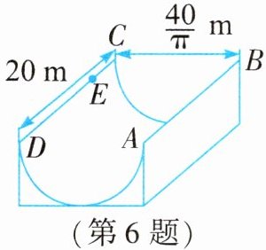 6. 如图,这是一个供滑板爱好者使用的 $ U $ 形池的示意图,该 $ U $ 形池可以看成是长方体去掉一个“半圆柱”而成,中间可供滑行部分的截面是直径为 $ \frac{40}{\pi}\ m $ 的半圆,其边缘 $ AB = CD = 20\ m $,点 $ E $ 在 $ CD $ 上,$ CE = 5\ m $,一滑板爱好者从点 $ A $ 滑到点 $ E $,则他滑行的最短路程约为