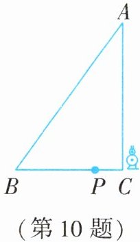 10. 某校机器人兴趣小组在如图所示的三角形场地上开展训练。已知 $ AB = 10 $,$ BC = 6 $,$ AC = 8 $,机器人从点 $ C $ 出发,沿着 $ \triangle ABC $ 的边按 $ C \to B \to A \to C $ 的方向匀速移动到点 $ C $ 停止。机器人移动的速度为每秒 2 个单位长度,移动至拐角处调整方向需要 $ 1\ s $(即在 $ B,A $ 处拐弯时分别用时 $ 1\ s $)。设机器人所用时间为 $ t\ s $,其所在位置用点 $ P $ 表示(机器人大小不计)。