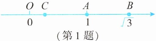 1. 如图,1 和 $\sqrt{3}$ 在数轴上的对应点分别为 A 和 B,点 C 在射线 OA 上,且 $AC = AB$,则点 C 所表示的实数为(