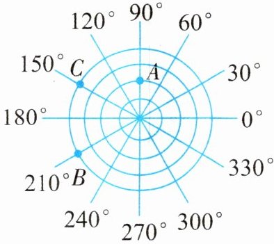 ④如图所示的是一台雷达探测相关目标得到的部分结果,若图中目标$A$的位置为$(2,90^{\circ})$,$B$的位置为$(4,210^{\circ})$,则$C$的位置为$(4,150^{\circ})$。