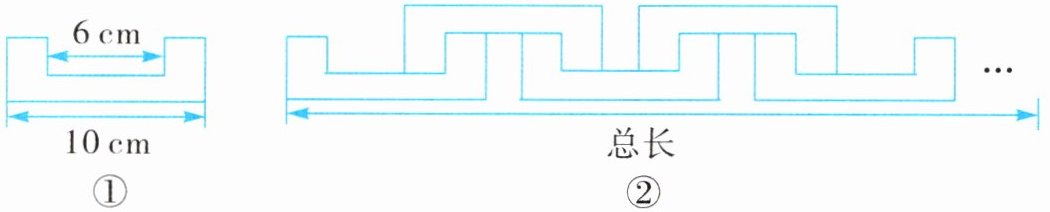 如图①所示的是一个轴对称图形,且每个角都是直角,小明用 $ x $ 个这样的图形,按照如图②所示的方法玩拼图游戏,两两相扣,相互间不留空隙。则图形的总长 $ y $ 与图形个数 $ x $ 之间的关系式为