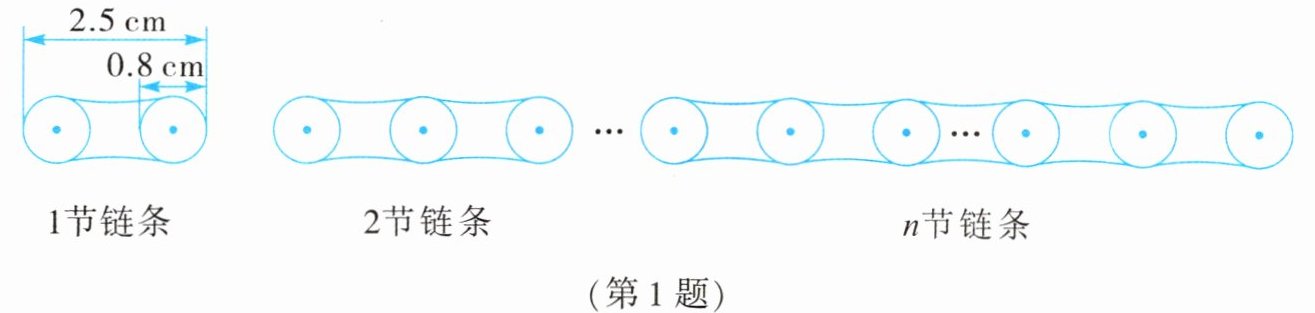 1. 某品牌的自行车链条每节长为 $ 2.5 cm $,每两节链条相连部分重叠的圆的直径为 $ 0.8 cm $,按照如图所示的这种连接方式,$ n $ 节链条总长度为 $ y cm $,则 $ y $ 与 $ n $ 之间的关系式是(
