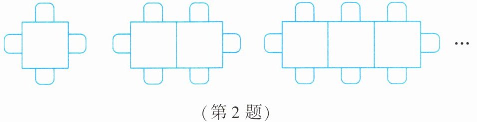 2. 学校食堂按如图所示的方式摆放餐桌和椅子。若用 $ x $ 表示餐桌的张数,$ y $ 表示椅子的把数,请你写出椅子数 $ y $(把)与餐桌数 $ x $(张)之间的关系式: