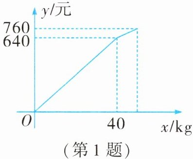 (2)降价后苹果的销售量为$(760-640)÷(16-4)=10(kg)$。降价后,10 kg 苹果的销售金额为 120 元,可得苹果的销售价为 12 元/kg。所以降价后销售金额 y(元)与销售量 x(kg)之间的关系式是$y=12x+160(40<x≤50)$
