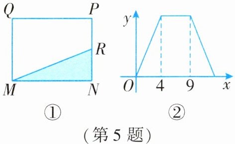 5. 如图①,在长方形 $ MNPQ $ 中,动点 $ R $ 从点 $ N $ 出发,速度为 1 cm/s,沿 $ N \to P \to Q \to M $ 方向运动至点 $ M $ 处停止。设点 $ R $ 运动的路程为 $ x $ cm,$ \triangle MNR $ 的面积为 $ y $ $ cm^2 $,如果 $ y $ 与 $ x $ 之间的关系如图②所示,那么长方形 $ MNPQ $ 的面积为(