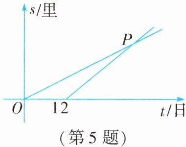 5. 元朝朱世杰的《算学启蒙》一书记载:“今有良马日行二百四十里,驽马日行一百五十里。驽马先行一十二日,问:良马几何日追及之?”如图所示的是两匹马的行走路程 $ s $ 与行走时间 $ t $ 之间的关系,则点 $ P $ 的坐标是