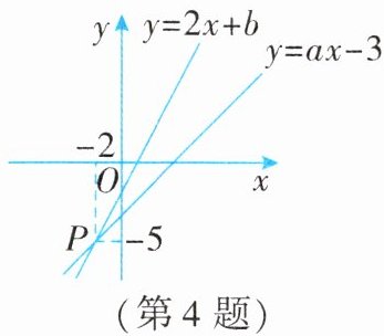 4. 如图,已知函数 $ y = 2x + b $ 和 $ y = ax - 3 $ 的图象交于点 $ P(-2, -5) $,根据图象可得方程 $ 2x + b = ax - 3 $ 的解是