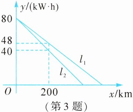 3. 某公司生产了 A,B 两款新能源电动汽车。如图,$ l_1 $,$ l_2 $ 分别表示 A 款、B 款新能源电动汽车充满电后电池的剩余电量 $ y $(kW·h)与行驶路程 $ x $(km)之间的关系。当这两款新能源电动汽车的行驶路程都是 300 km 时,A 款新能源电动汽车电池的剩余电量比 B 款新能源电动汽车电池的剩余电量多多少千瓦时?