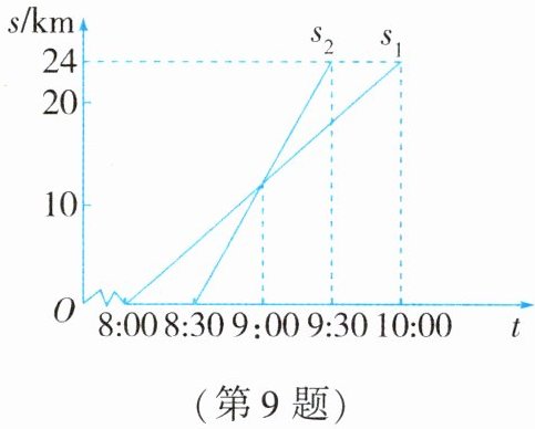 9. 小亮家与姥姥家相距 $ 24\ km $,小亮 $ 8:00 $ 从家出发,骑自行车去姥姥家。妈妈 $ 8:30 $ 从家出发,乘车沿相同路线去姥姥家。在同一平面直角坐标系中,小亮和妈妈的行进路程 $ s(km) $ 与时间 $ t(时) $ 之间的关系如图所示。根据图象得到下列结论,其中错误的是(