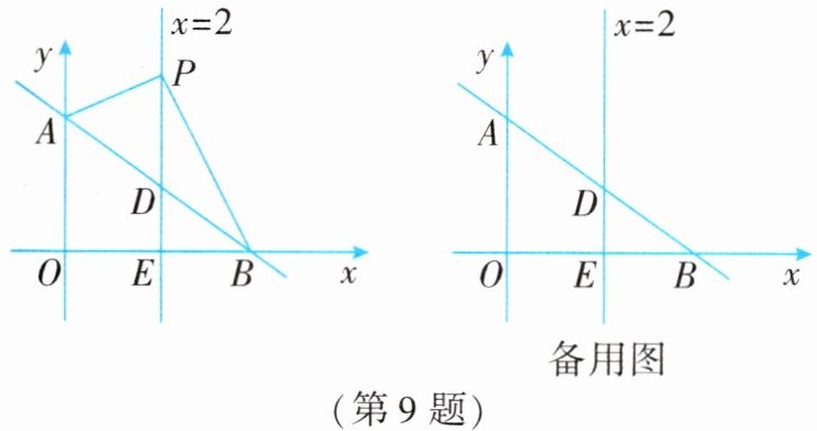 9. 如图,在平面直角坐标系中,直线 $ AB:y = -\dfrac{3}{4}x + b $ 交 $ y $ 轴于点 $ A(0,3) $,交 $ x $ 轴于点 $ B $,直线 $ x = 2 $ 交 $ AB $ 于点 $ D $,交 $ x $ 轴于点 $ E $,$ P $ 是直线 $ x = 2 $ 上一动点,且在点 $ D $ 的上方。设点 $ P $ 的坐标为 $ (2,n) $。