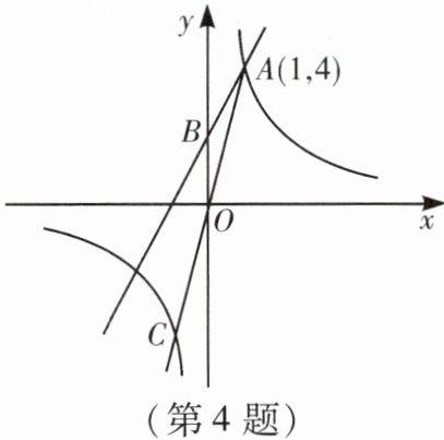4. (2022·镇江中考)如图,一次函数 $ y = 2x + b $ 的图象与反比例函数 $ y = \frac{k}{x}(k \neq 0) $ 的图象交于点 $ A(1,4) $,与 $ y $ 轴交于点 $ B $.