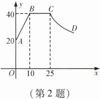2. 心理学家研究发现,一般情况下,在一节 $ 40 $ 分的课堂中,学生的注意力随教师讲课时间的变化而变化。开始上课时,学生的注意力逐步增强,中间有一段时间学生的注意力保持较为理想的稳定状态,随后学生的注意力开始分散。经过实验分析可知,学生的注意力指标数 $ y $ 随时间 $ x $(分)的变化规律如图所示(其中 $ AB $,$ BC $ 分别为线段,$ CD $ 为双曲线的一部分)。