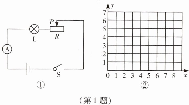 1. (2023·达州中考)背景 在一次物理实验中,小冉同学用一固定电压为 $ 12 V $ 的蓄电池,通过调节滑动变阻器来改变电流大小,完成控制灯泡 $ L $(灯丝的阻值 $ R_{L} = 2 \Omega $)亮度的实验(如图①),已知串联电路中,电流与电阻 $ R $、$ R_{L} $ 之间关系为 $ I = \frac{U}{R + R_{L}} $,通过实验得出如下数据: