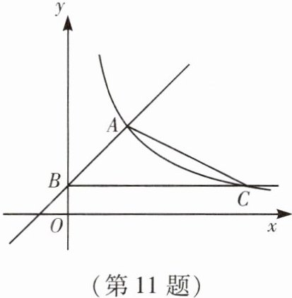 11. (2023·江西中考)如图,已知直线 $ y = x + b $ 与反比例函数 $ y = \frac{k}{x} (x > 0) $ 的图象交于点 $ A(2, 3) $,与 $ y $ 轴交于点 $ B $,过点 $ B $ 作 $ x $ 轴的平行线交反比例函数 $ y = \frac{k}{x} (x > 0) $ 的图象于点 $ C $。