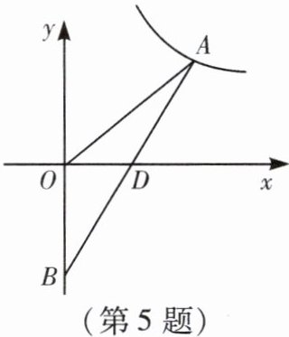 5. (2022·锦州中考) 如图,在平面直角坐标系中,$\triangle AOB$的边$OB$在$y$轴上,$AB$与$x$轴交于点$D$,且$BD = AD$,反比例函数$y=\dfrac{k}{x}(x>0)$的图象经过点$A$。若$S_{\triangle OAB}=1$,则$k$的值为