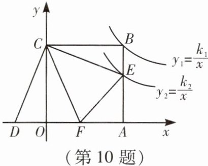 10. (2022·鄂尔多斯中考改编)如图,在正方形 $OABC$ 中,其顶点 $A,C$ 分别在 $x$ 轴,$y$ 轴上,$E,F$ 分别是 $AB,OA$ 上的点,$\angle ECF = 45^{\circ}$,将 $\triangle ECF$ 沿 $CF$ 翻折得到 $\triangle DCF$,点 $D$ 在 $x$ 轴上。若反比例函数 $y_{1}=\frac{k_{1}}{x}$ 和 $y_{2}=\frac{k_{2}}{x}$ 的图象分别经过点 $B,E$,$S_{\triangle COD}=5$,则 $k_{1}-k_{2}$ 的值为(