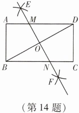 14. (2022·枣庄中考改编)如图,在矩形 $ABCD$ 中,按以下步骤作图:①分别以点 $B,D$ 为圆心,大于 $\frac{1}{2}BD$ 的长为半径画弧,两弧相交于点 $E,F$;②作直线 $EF$,分别与 $AD,BD,BC$ 交于点 $M,O,N$。若 $AM = 3$,$DM = 5$,则 $MN=$