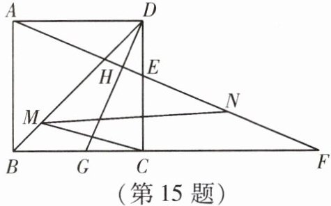 15. (2022·安顺中考)如图,在正方形 $ABCD$ 中,$AB = 4$,$E$ 为 $CD$ 上一点,连接 $AE$ 并延长,交 $BC$ 的延长线于点 $F$,过点 $D$ 作 $DG\perp AF$,垂足为 $H$,交 $BF$ 于点 $G$,$N$ 为 $EF$ 的中点,$M$ 为 $BD$ 上一动点,连接 $MC,MN$。若 $\frac{S_{\triangle DCG}}{S_{\triangle FCE}}=\frac{1}{9}$,则 $MC + MN$ 的最小值为