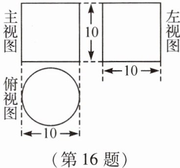 16. 一个立体图形的三视图如图所示,请根据视图写出该立体图形的名称,并计算该立体图形的体积。(结果保留 $\pi$)