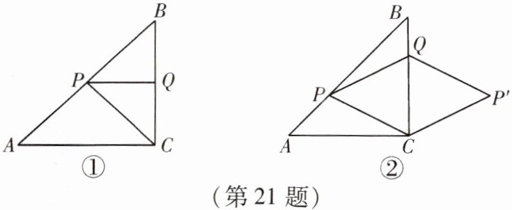 21. (2022·枣庄中考)如图①,在 $Rt\triangle ABC$ 中,$\angle ACB = 90^{\circ}$,$AC = BC = 4cm$。点 $P$ 从点 $A$ 出发,沿 $AB$ 以 $\sqrt{2}cm/s$ 的速度向点 $B$ 运动,同时点 $Q$ 从点 $B$ 出发沿 $BC$ 以 $1cm/s$ 的速度向点 $C$ 运动,设运动的时间为 $t s$。