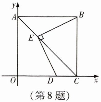 8. 如图,在平面直角坐标系中,正方形 $ABCO$ 的顶点 $B$ 的坐标为 $(3,3)$,点 $A$,$C$ 分别在 $y$ 轴、$x$ 轴上,对角线 $AC$ 上有一动点 $E$,连接 $BE$,过 $E$ 作 $DE \perp BE$ 交 $OC$ 于点 $D$. 若点 $D$ 的坐标为 $(2,0)$,则点 $E$ 的坐标是