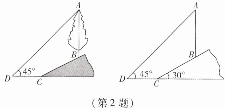 2. ($2024·$通辽中考)在“综合与实践”活动课上,活动小组测量一棵杨树的高度。如图,从点$C$测得杨树底端点$B$的仰角是$30^{\circ}$,$BC$长$6\ m$,在距离点$C$$4\ m$处的点$D$测得杨树顶端点$A$的仰角为$45^{\circ}$,求杨树$AB$的高度(结果精确到$0.1\ m$,$AB$,$BC$,$CD$在同一平面内,点$C$,$D$在同一水平线上;参考数据:$\sqrt{3}\approx1.73$)。