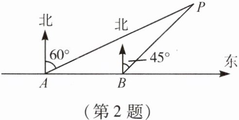 2. 为了维护国家主权和海洋权益,海监部门对我国领海实现了常态化巡航管理。如图,正在执行巡航任务的海监船以每时$40\ n mile$的速度向正东方向航行,在$A$处测得灯塔$P$在北偏东$60^{\circ}$方向上,继续航行$30\ min$后到达$B$处,此时测得灯塔$P$在北偏东$45^{\circ}$方向上。