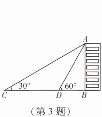 3. 某中学九年级的学生开展测量物体高度的实践活动,他们要测量一幢建筑物 AB 的高度。如图,他们先在点 C 处测得建筑物 AB 的顶点 A 的仰角为 30°,然后向建筑物 AB 前进 20 m 到达点 D 处,又测得点 A 的仰角为 60°,则建筑物 AB 的高度是