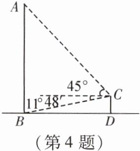 4. 一座巨大的塑像矗立在古城东门外。如图,小明在东门城墙上 C 处测得塑像底部 B 处的俯角为 11°48′,测得塑像顶部 A 处的仰角为 45°,点 D 在观测点 C 正下方城墙底的地面上。若 CD = 10 m,则此塑像的高 AB 约为