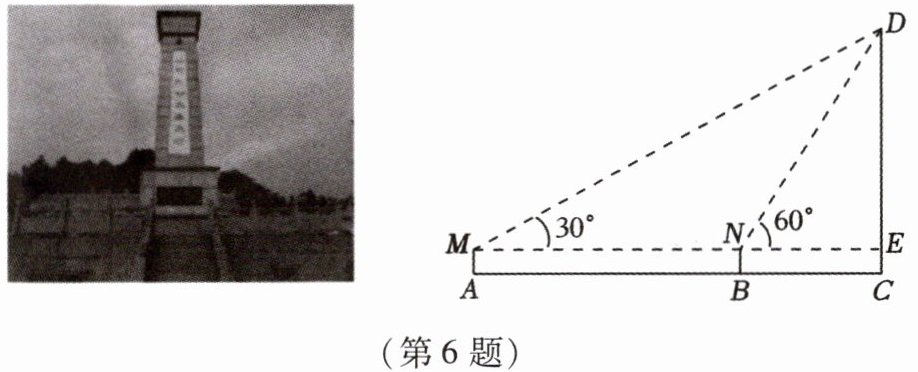 6. (2023·怀化中考)为弘扬革命传统精神,清明期间,某校组织学生前往怀化市烈士陵园缅怀革命先烈。大家被革命烈士纪念碑的雄伟壮观震撼,想知道纪念碑的通高 $CD$(碑顶到水平地面的距离),于是师生组成综合实践小组进行测量。他们在地面的 $A$ 点用测角仪测得碑顶 $D$ 的仰角为 $30^{\circ}$,在 $B$ 点处测得碑顶 $D$ 的仰角为 $60^{\circ}$,已知 $AB = 35$ m,测角仪的高度是 $1.5$ m($A$,$B$,$C$ 在同一直线上),根据以上数据求烈士纪念碑的通高 $CD$。(结果精确到 $0.1$ m;参考数据:$\sqrt{3} \approx 1.732$)