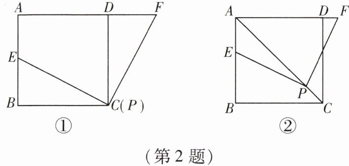 2. (1)如图①,已知 $\angle EPF = 90°$,$\angle EPF$ 的顶点和正方形 $ABCD$ 的顶点 $C$ 重合,两直角边 $PE$,$PF$ 分别和 $AB$,$AD$ 所在直线交于点 $E$,$F$,求 $PE$ 与 $PF$ 之间的数量关系;