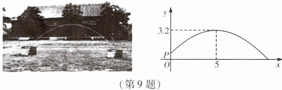 9. (2022·河南中考)小红看到一处喷水景观,喷出的水柱呈抛物线形状,她对此展开研究:测得喷水头$P$距地面$0.7$m,水柱在距喷水头$P$水平距离$5$m处达到最高,最高点距地面$3.2$m;建立如图所示的平面直角坐标系,并设抛物线的表达式为$y = a(x - h)^{2}+k$,其中$x$($m$)是水柱距喷水头$P$的水平距离,$y$($m$)是水柱距地面的高度.
