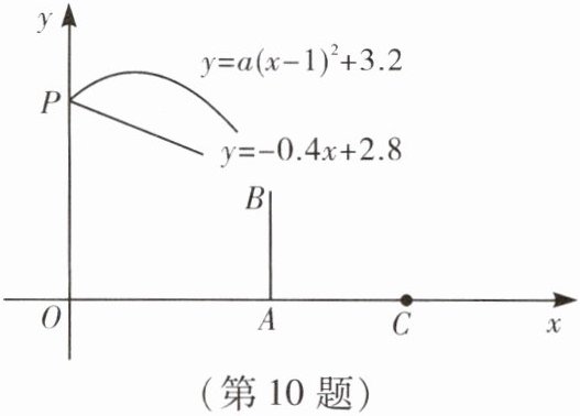 如图,在平面直角坐标系中,点$A$,$C$在$x$轴上,球网$AB$与$y$轴的水平距离$OA = 3$m,$CA = 2$m,击球点$P$在$y$轴上. 若选择扣球,羽毛球的飞行高度$y$($m$)与水平距离$x$($m$)之间近似满足一次函数关系$y = -0.4x + 2.8$;若选择吊球,羽毛球的飞行高度$y$($m$)与水平距离$x$($m$)之间近似满足二次函数关系$y = a(x - 1)^{2}+3.2$.