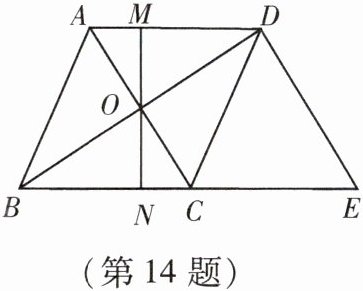 14. 如图,在菱形ABCD中,对角线AC与BD相交于点O,MN过点O且与边AD,BC分别交于点M和点N.
