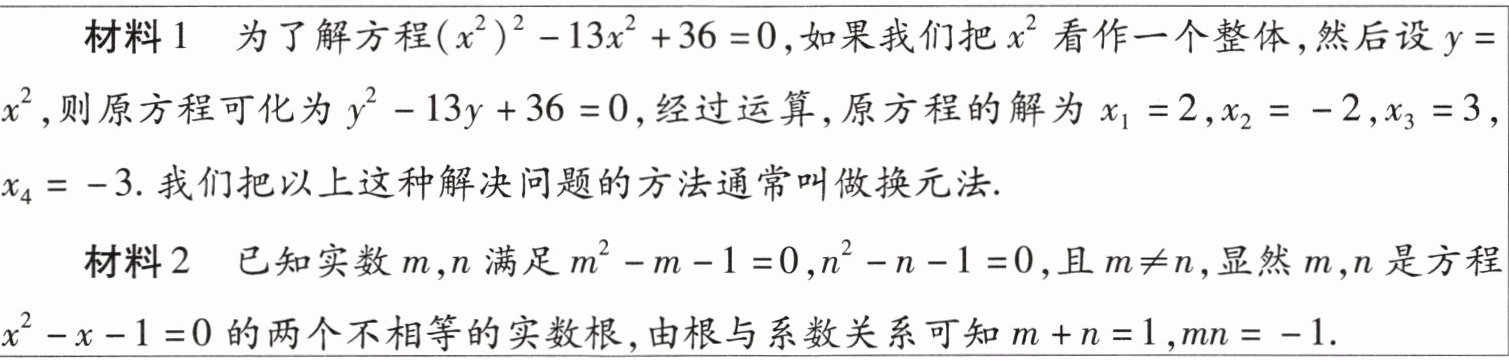 材料 1 为了解方程$(x^{2})^{2}-13x^{2}+36 = 0$,如果我们把$x^{2}$看作一个整体,然后设$y = x^{2}$,则原方程可化为$y^{2}-13y + 36 = 0$,经过运算,原方程的解为$x_{1}=2,x_{2}=-2,x_{3}=3,x_{4}=-3$。我们把以上这种解决问题的方法通常叫做换元法。