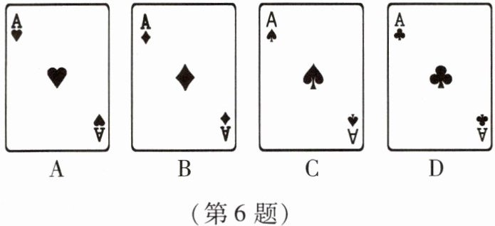 6. 如图,有四张背面相同的纸牌 $ A $,$ B $,$ C $,$ D $,其正面分别是红桃、方块、黑桃、梅花,其中红桃、方块为红色,黑桃、梅花为黑色,小明将这 $ 4 $ 张纸牌背面朝上洗匀后,摸出一张,将剩余 $ 3 $ 张洗匀后再摸出一张。