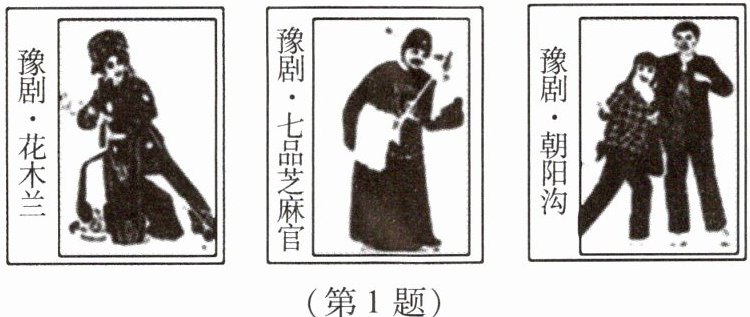 1. (2024·河南中考)豫剧是我国国家级非物质文化遗产,因其雅俗共赏,深受大众喜爱.正面印有豫剧经典剧目人物的三张卡片如图所示,它们除正面外完全相同.把这三张卡片背面朝上洗匀,从中随机抽取一张,放回洗匀后,再从中随机抽取一张,两次抽取的卡片正面相同的概率为(