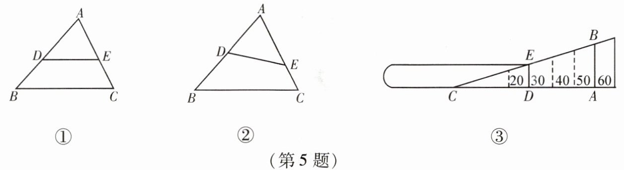 5. (1) 如图①,在 $\triangle ABC$ 中,$DE// BC$,$AD = 3$ cm,$BD = 2$ cm,$\triangle ADE$ 与 $\triangle ABC$ 是否相似: