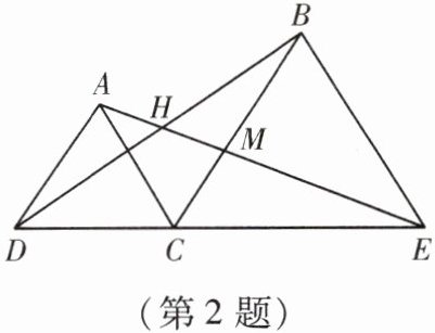 2. 如图,在线段 $DE$ 的同侧有等边三角形 $ACD$ 和等边三角形 $CBE$,且 $AE$,$BD$ 相交于点 $H$,$BC$,$AE$ 相交于点 $M$。