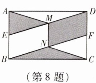 8. 如图,在矩形 $ ABCD $ 中,点 $ E $,$ F $ 分别是 $ AB $,$ CD $ 的中点,连接 $ DE $ 和 $ BF $,分别取 $ DE $,$ BF $ 的中点 $ M $,$ N $,连接 $ AM $,$ CN $,$ MN $. 若 $ AB = 2\sqrt{2} $,$ BC = 2\sqrt{3} $,则图中阴影部分的面积为