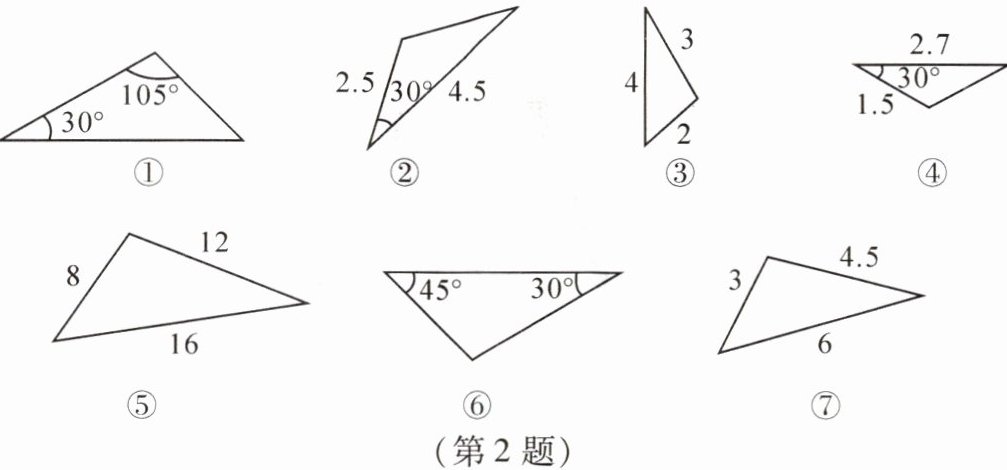 1. 要制作两个形状相同的三角形框架,已知其中一个三角形的三边长分别为 $5\mathrm{cm}$,$6\mathrm{cm}$ 和 $9\mathrm{cm}$,另一个三角形的最短边的长为 $2.5\mathrm{cm}$,则它的最长边的长为(