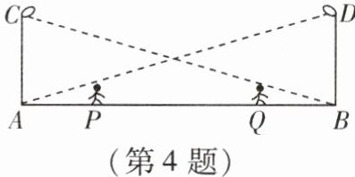 4. 如图,丁轩同学在晚上由路灯$AC$走向路灯$BD$,当他走到点$P$时,发现身后他影子的顶部刚好接触到路灯$AC$的底部,当他向前再步行$20m$到达$Q$点时,发现身前他影子的顶部刚好接触到路灯$B$的底部.已知丁轩同学的身高是$1.5m$,两个路灯的高度都是$9m$,则两路灯之间的距离是(