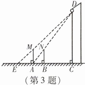 3. 一天晚上,李明和张龙利用灯光下的影子来测量一路灯$D$的高度,如图,当李明走到点$A$处时,张龙测得李明的身高$AM$与其影子长$AE$正好相等,接着李明沿$AC$方向继续向前走,走到点$B$处时,李明的影子恰好是线段$AB$,并测得$AB = 1.25m$.已知李明的身高为$1.75m$,求路灯的高$CD$的长.(结果精确到$0.1m$)