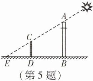 5. 小明想要测量出电线杆$AB$的高度,如图,他在电线杆旁的点$D$处立一标杆$CD$,使标杆的影子$DE$与电线杆的影子$BE$部分重叠(点$E$,$C$,$A$在同一直线上),量得$ED = 2m$,$DB = 4m$,$CD = 1.5m$,则电线杆$AB$的高为