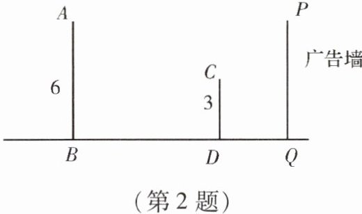 2. 某一广告墙$PQ$旁有两根直立的木杆$AB$和$CD$,某一时刻在太阳光下,木杆$CD$的影子刚好不落在广告墙$PQ$上.