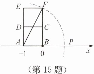 15. 将两张完全相同的正方形纸片$ABCD$、$CDEF$按如图所示的方式摆放,使边$AB$恰好落在数轴上,且点$A$、$B对应的数分别为-1$、$0$。连结$AF$,以点$A$为圆心、$AF$长为半径作弧,交数轴的正半轴于点$P$,则点$P$表示的数是