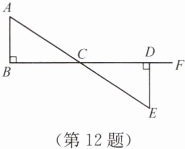 12. 如图,要测量河两岸相对两点$A与B$之间的距离,可以在$AB的垂线BF上取两点C$、$D$,使$CD= BC$。再作出$BF的垂线DE$,使$A$、$C$、$E$三点在同一条直线上,这时测得$DE的长就是AB$的长。试说明理由。