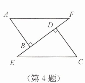 4. 如图,$ AB \perp EF $,$ CD \perp EF $,垂足分别为点 $ B $ 和点 $ D $,$ BE = DF $。若要用“HL”判定 $ Rt \triangle ABF \cong Rt \triangle CDE $,则需要添加的条件为: