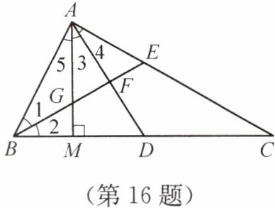 16. (沈丘期中)如图,在$\triangle ABC$中,$∠BAC = 90^{\circ}$,$BE平分∠ABC$,$AM \perp BC于点M$,交$BE于点G$,$AD平分∠MAC$,交$BC于点D$,交$BE于点F$.