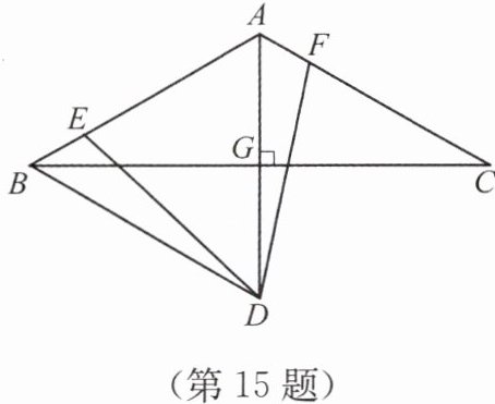 15. 在$\triangle ABC$中,$AB = AC$,$∠BAC = 120^{\circ}$,$AD \perp BC$,垂足为$G$,且$AD = AB$,$∠EDF = 60^{\circ}$,其两边$DE$、$DF分别交边AB$、$AC于点E$、$F$.求证: